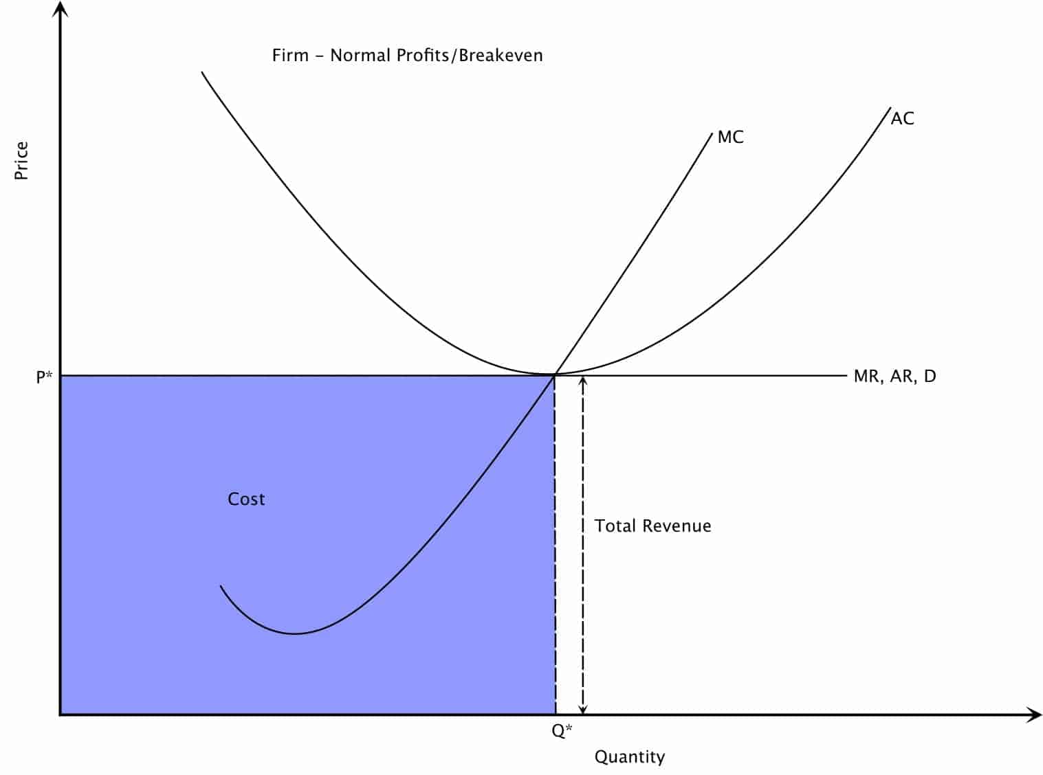 The firms will continue leaving the industry until the price is equal to average cost so that the companies remaining in the field are making only normal profits. Normal Profits, also known as the break-even or zero economic profit, includes the profit paid to the entrepreneur (included in the total cost, for bringing in scarce resources and taking on risk), and the total cost is equal to total revenue. A firm making normal profits will remain in the industry.